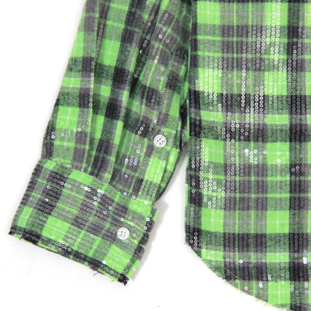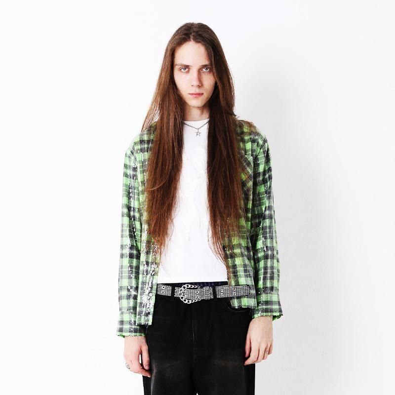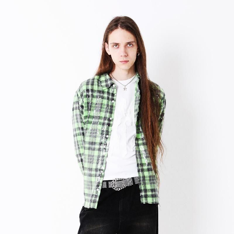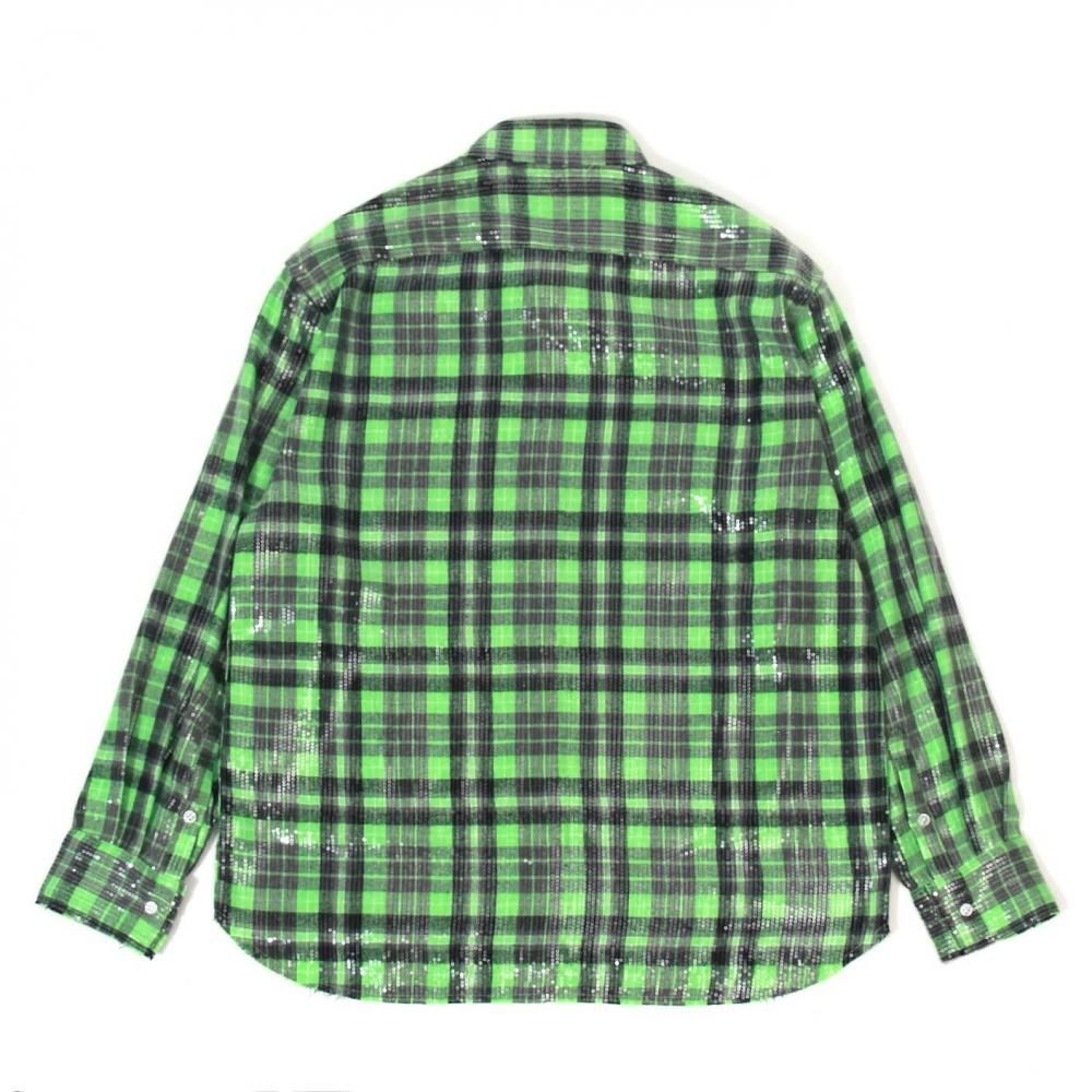 チェックシャツに一点一点丁寧にびっしりとスパンコールを配しました。
