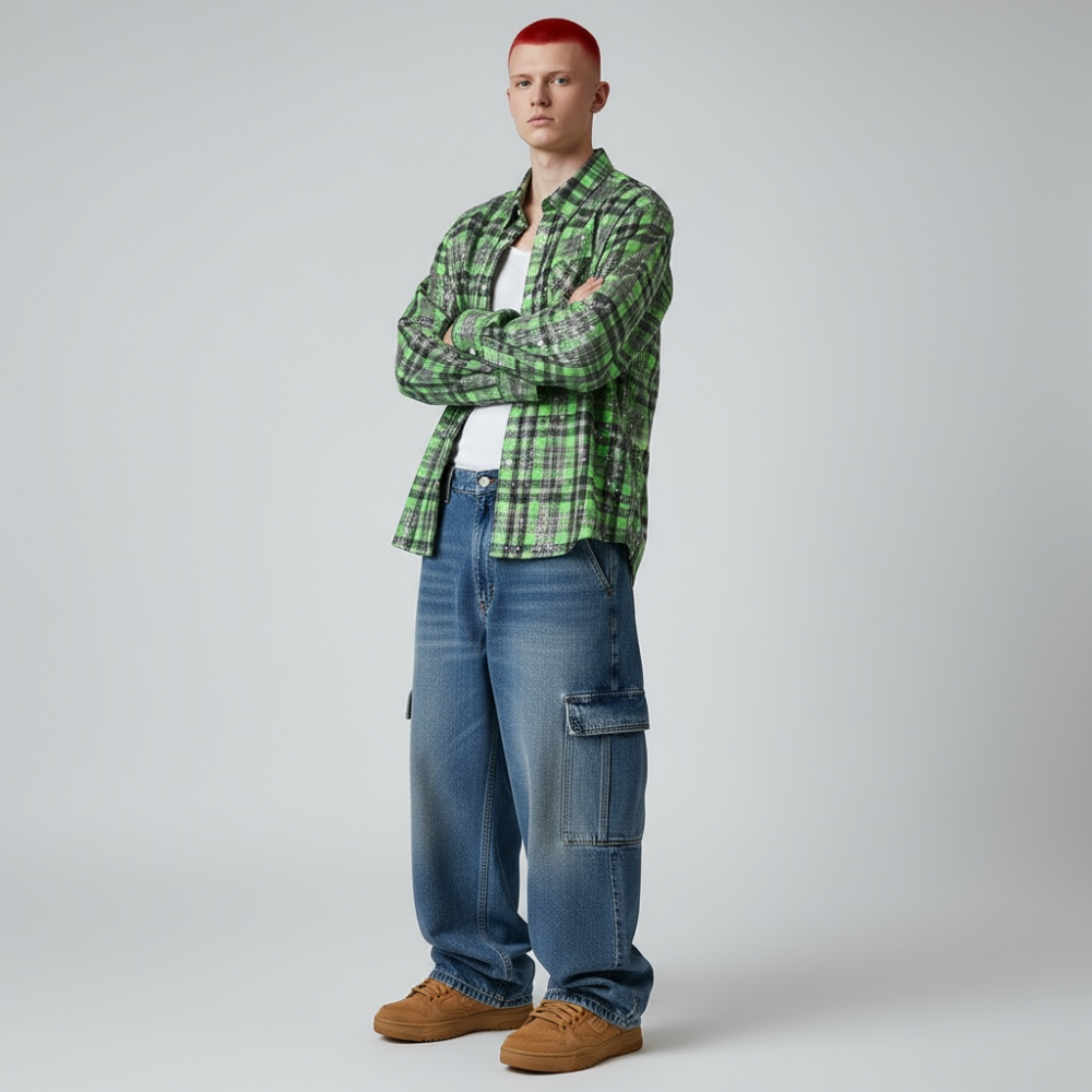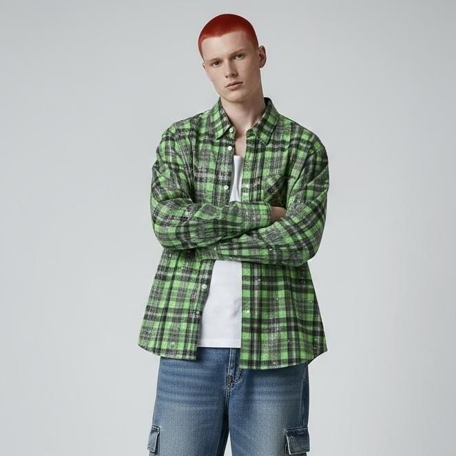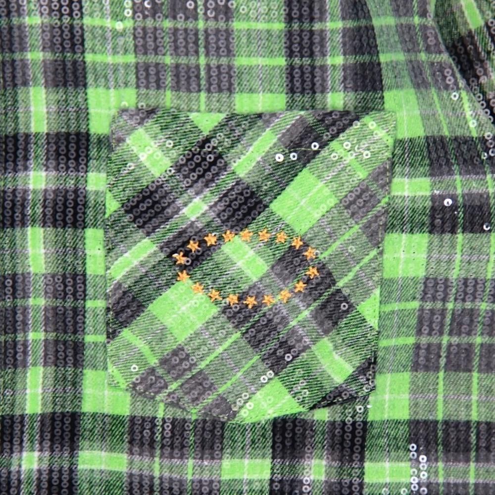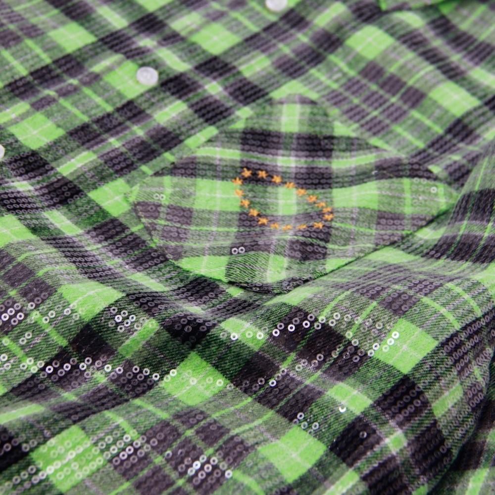 チェックシャツに一点一点丁寧にびっしりとスパンコールを配しました。