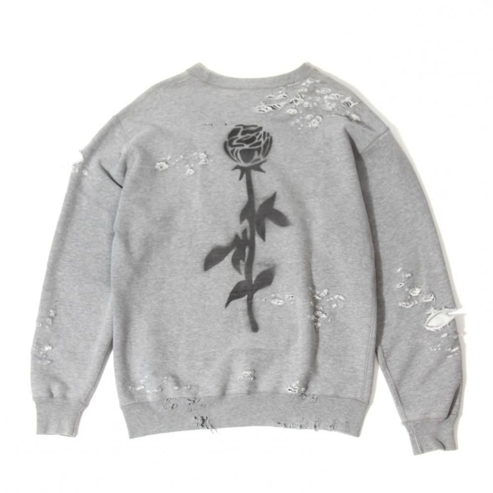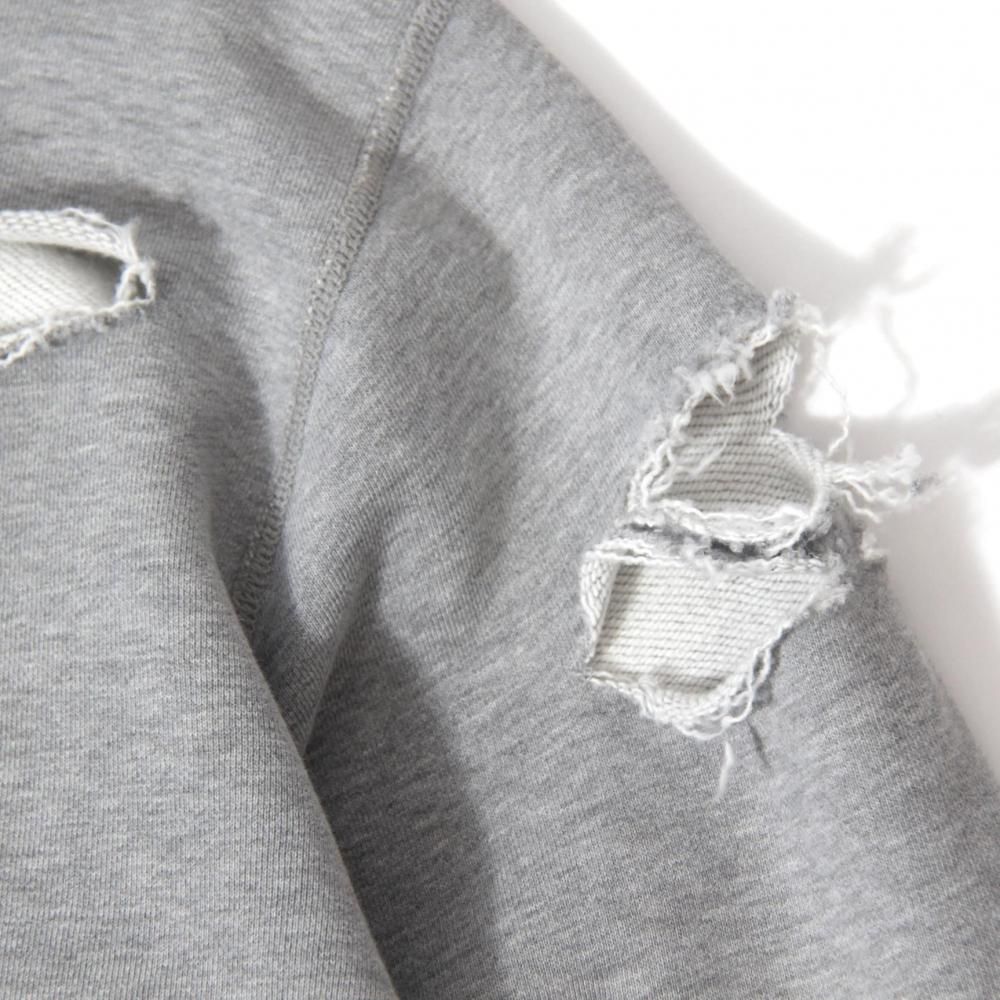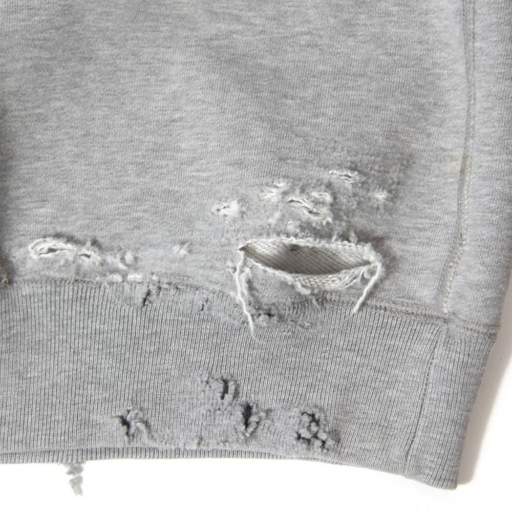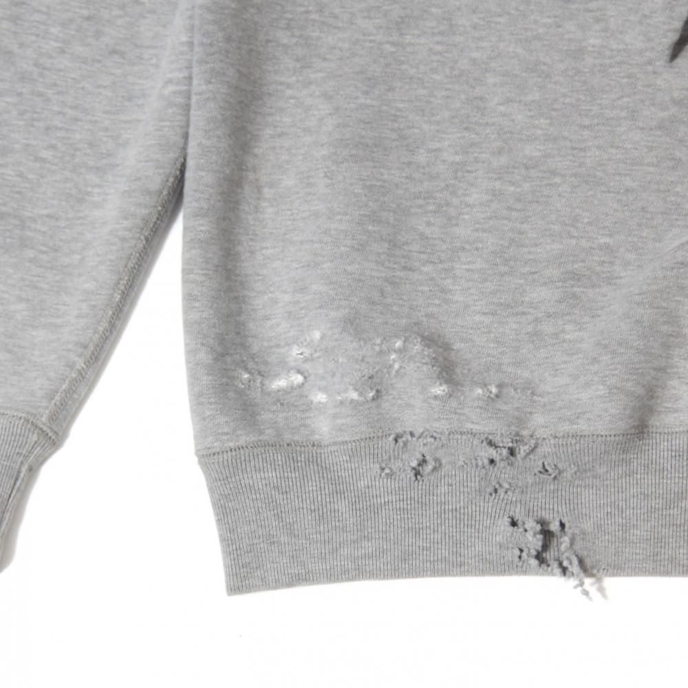裏毛のスウェットに絶妙なバランスでダメージを加え、ロゴ下に刺繍を施しました。