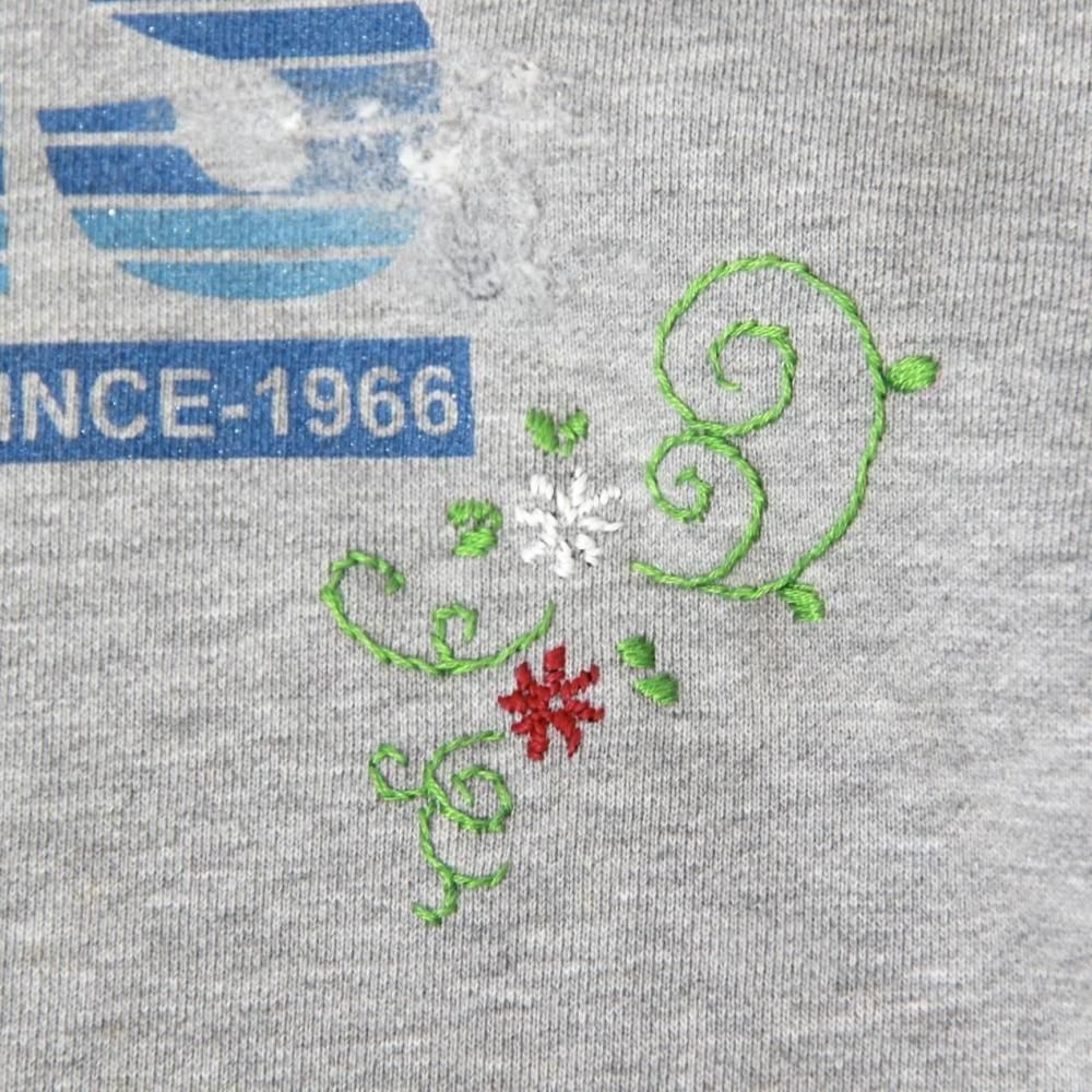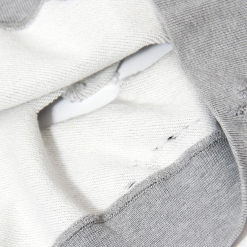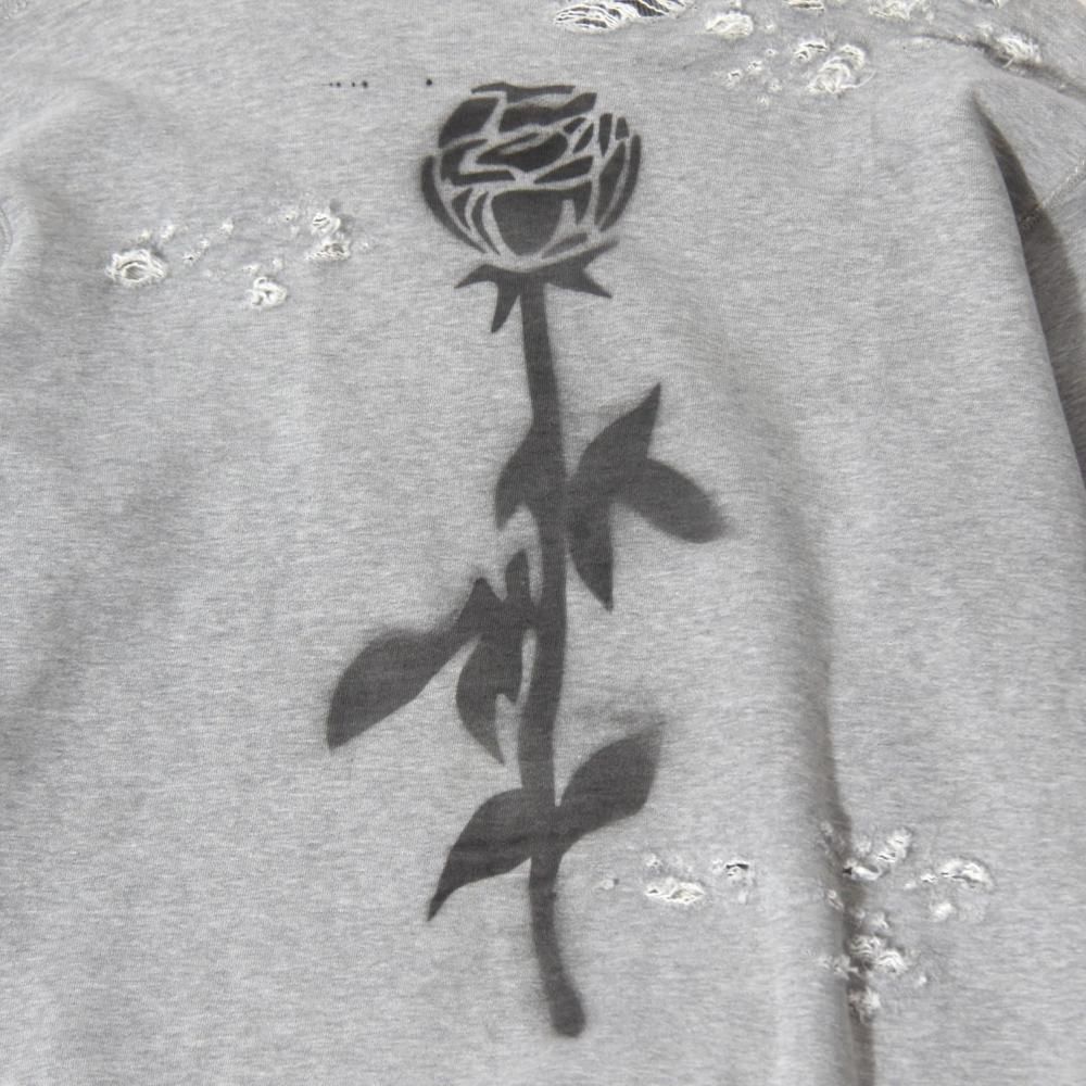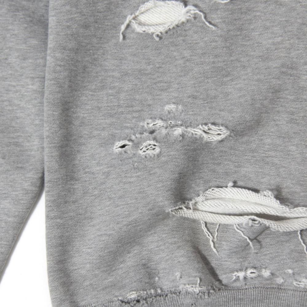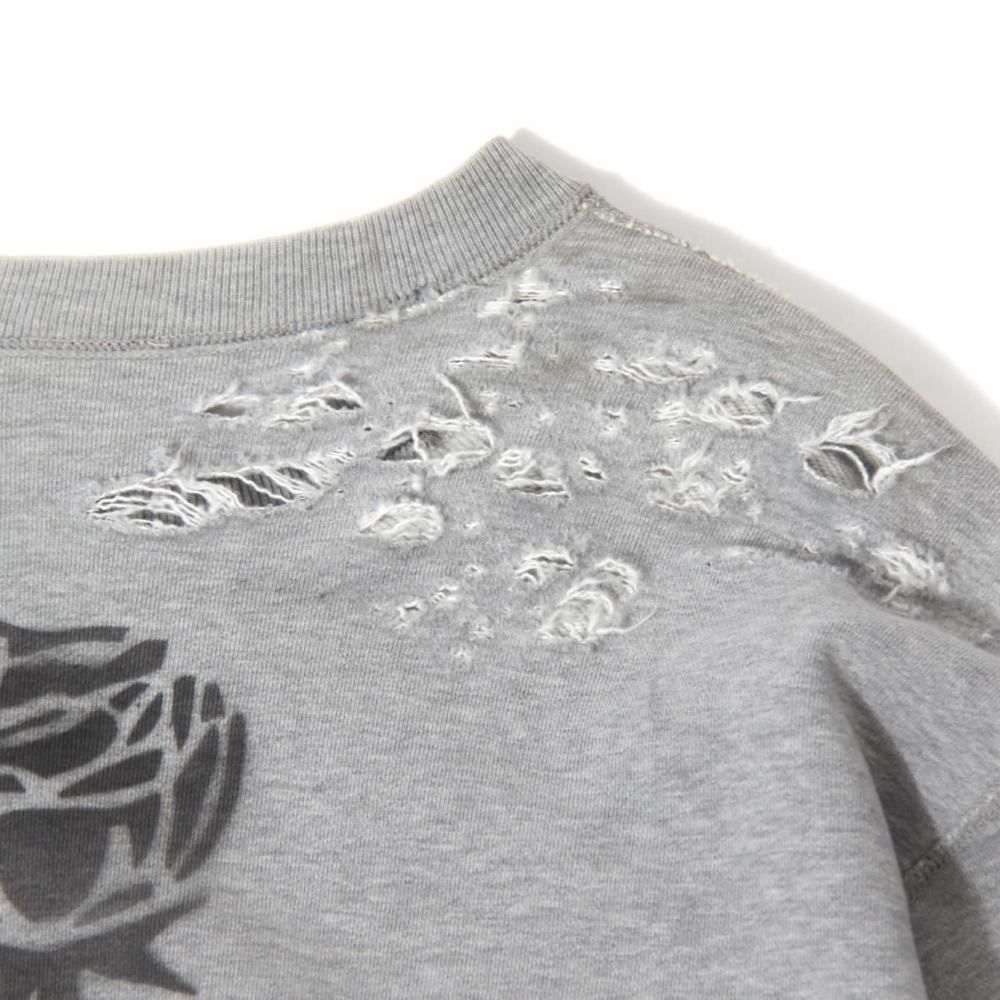 裏毛のスウェットに絶妙なバランスでダメージを加え、ロゴ下に刺繍を施しました。