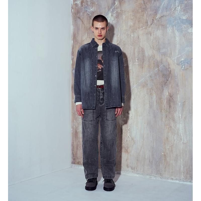 00年代の立体裁断デニムの代表格を現代に蘇らせたかのような、美しいシルエットのデニムパンツ。 切り替えとスタッズを組み合わせ、履き込んだような味わいを持たせた逸品です。
