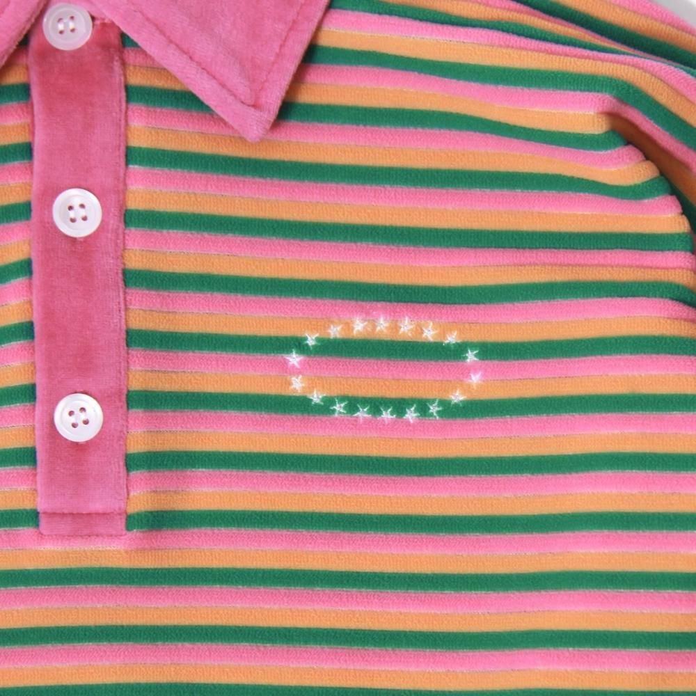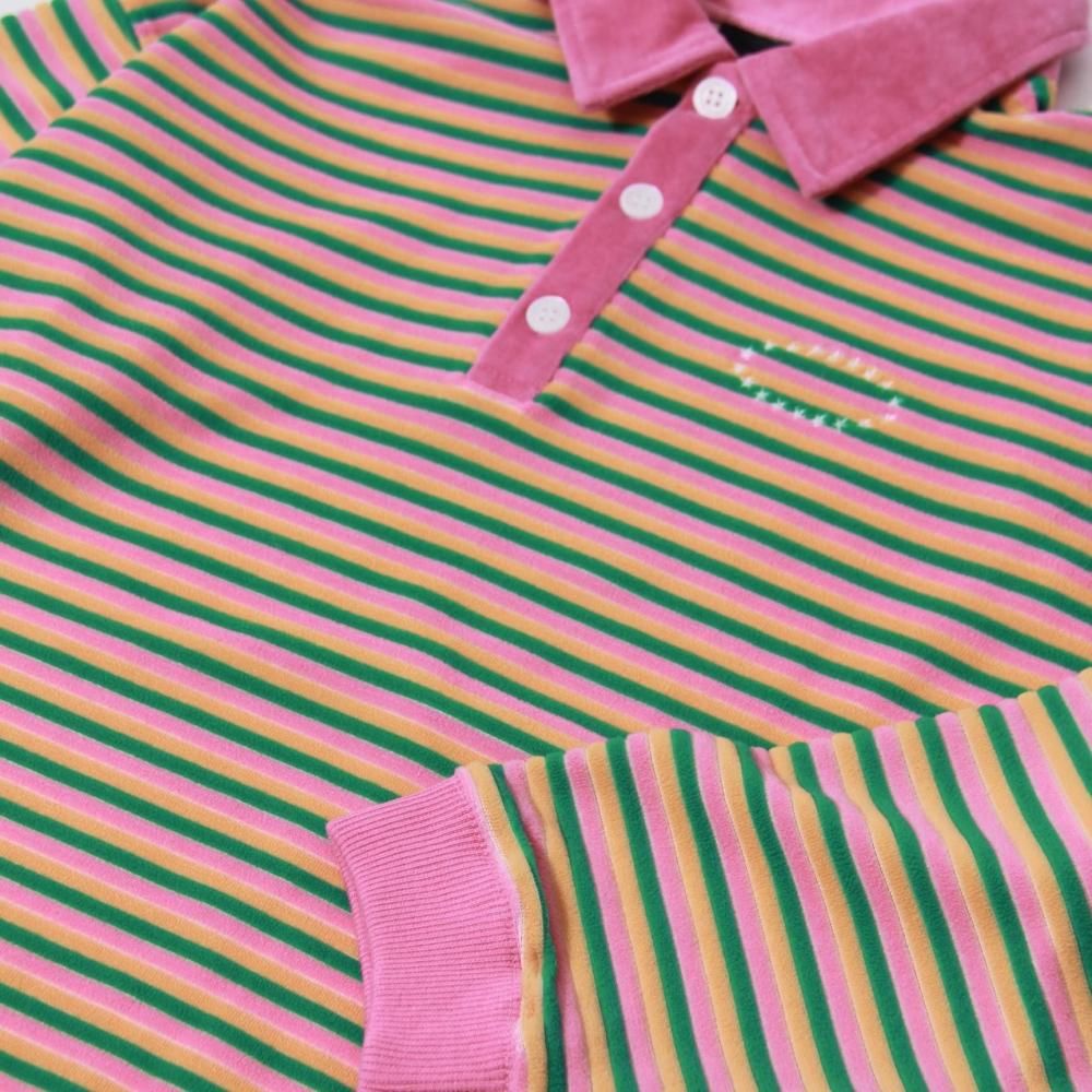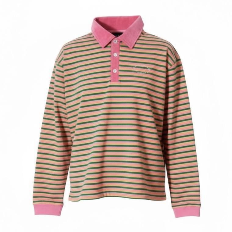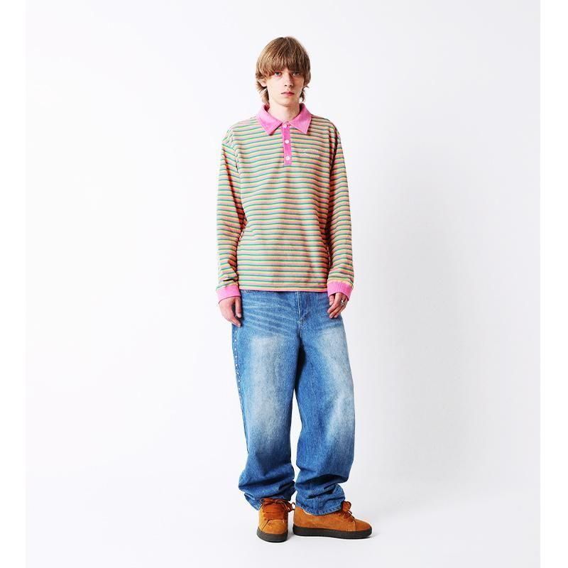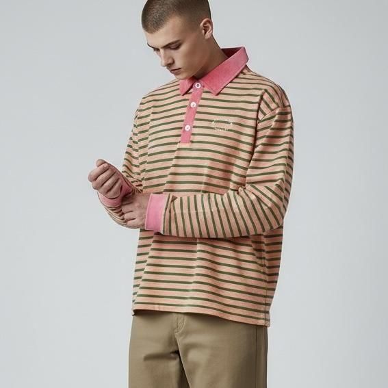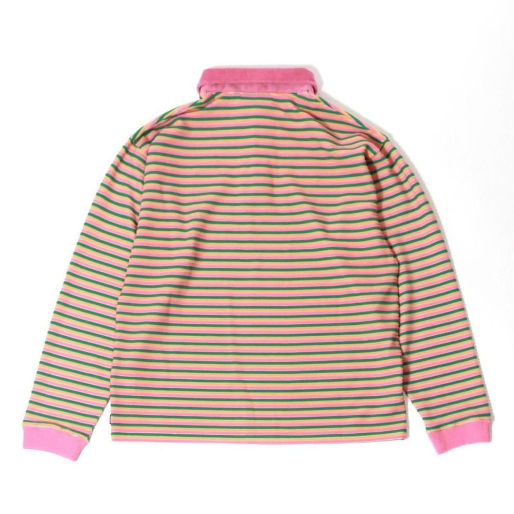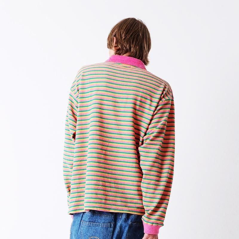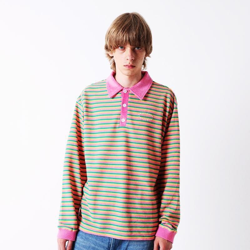 パイル生地で仕立てたボーダー長袖ポロシャツ。