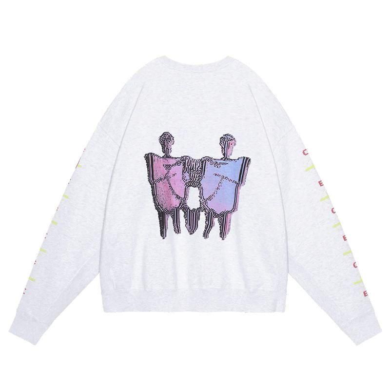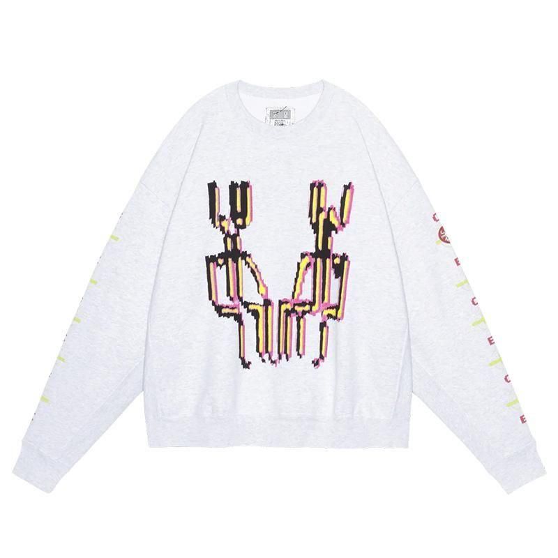 100%コットン。スウェット生地。 プルオーバー。クルーネック。セットインスリーブ。 前身頃、後身頃、袖にグラフィック。後ろ身頃裏に布パッチ。 左袖上部にシリコンパッチ。袖下、脇で生地切り替え。 ワイドシルエット。ウォッシュ加工。 日本製。