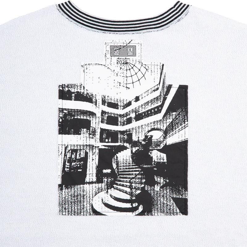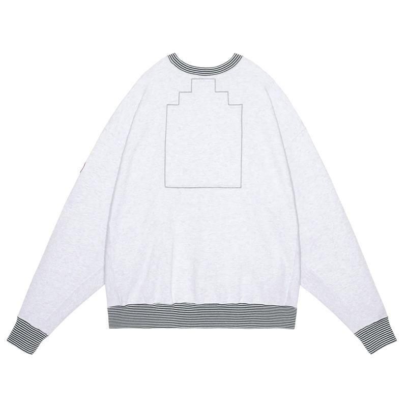 100%コットン。スウェット生地。 プルオーバー。クルーネック。セットインスリーブ。 前身頃にグラフィック。後ろ身頃裏に布パッチ。 後ろ身頃表にリフレクタープリント。左袖上部にシリコンパッチ。 襟、袖口、裾にストライプリブ。袖下、脇で生地切り替え。 ワイドシルエット。ウォッシュ加工。 日本製。