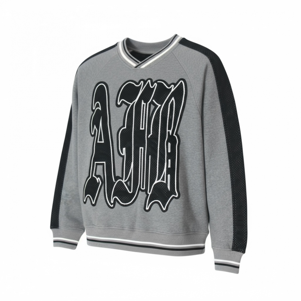 袖の切り替えやクロスオーバーVネックでスポーティーかつリブのボーダーでカレッジの香りを加えて仕上げました。