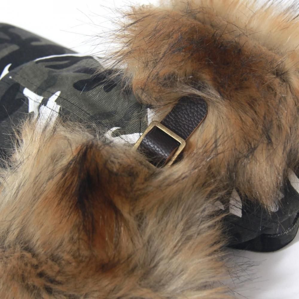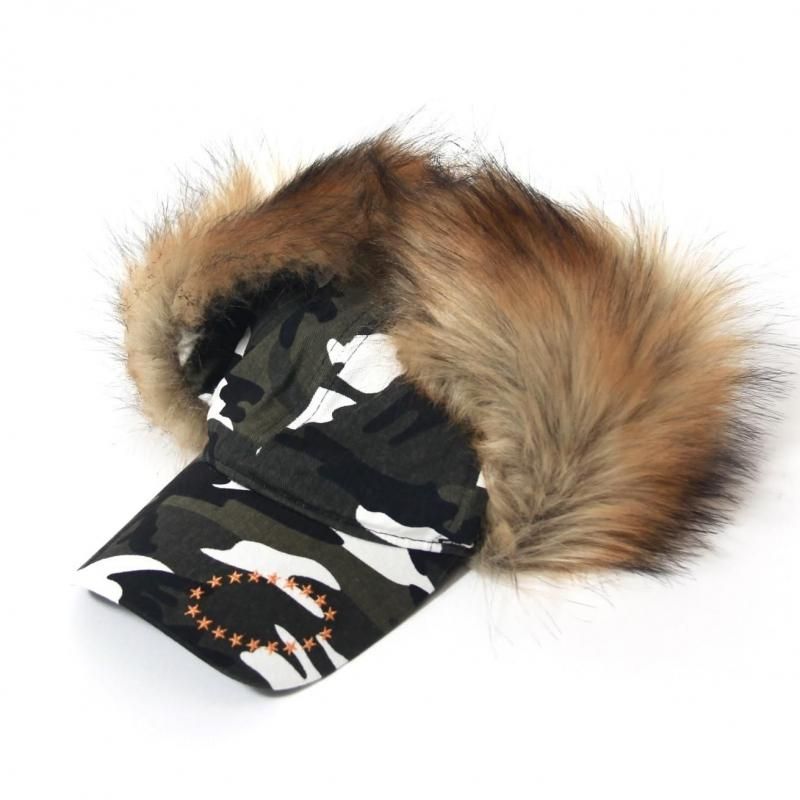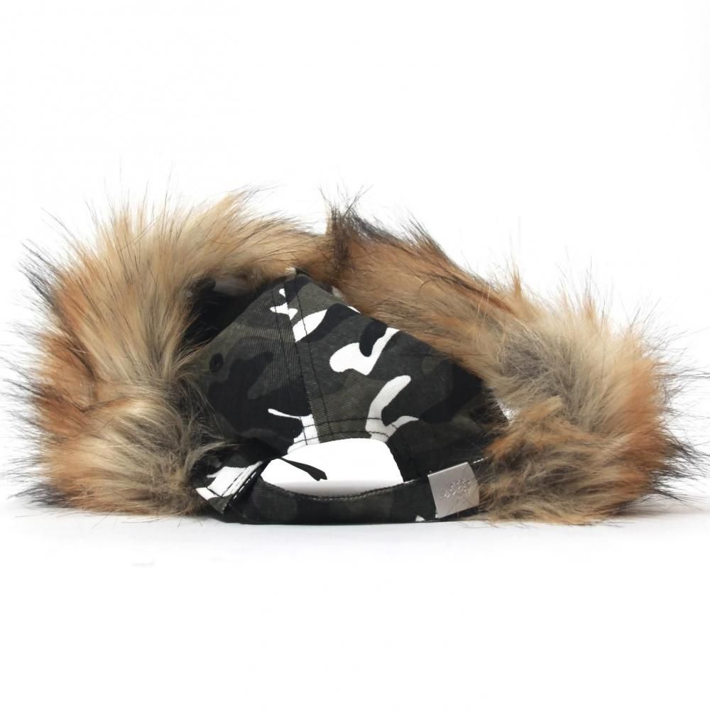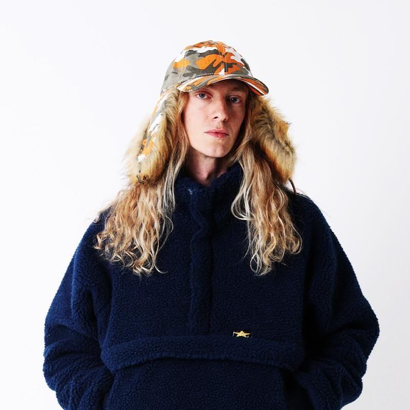 カモ柄のCAPに、ファー付きの耳当てを組み合わせ「DOG EAR」=犬の垂れ耳と名付けた実用的かつ非常にインパクトのあるアイテムです。