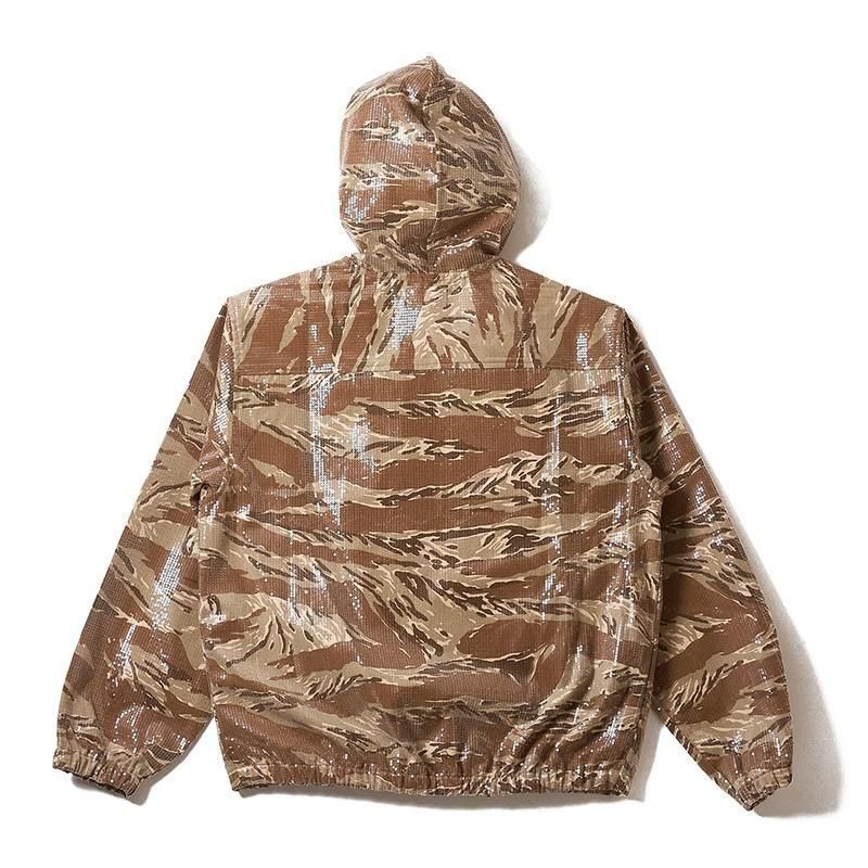 タイガーカモ柄の生地にスパンコールを施したフード付きジャケット。