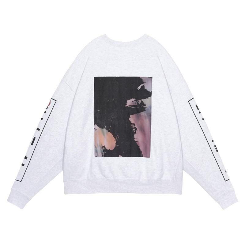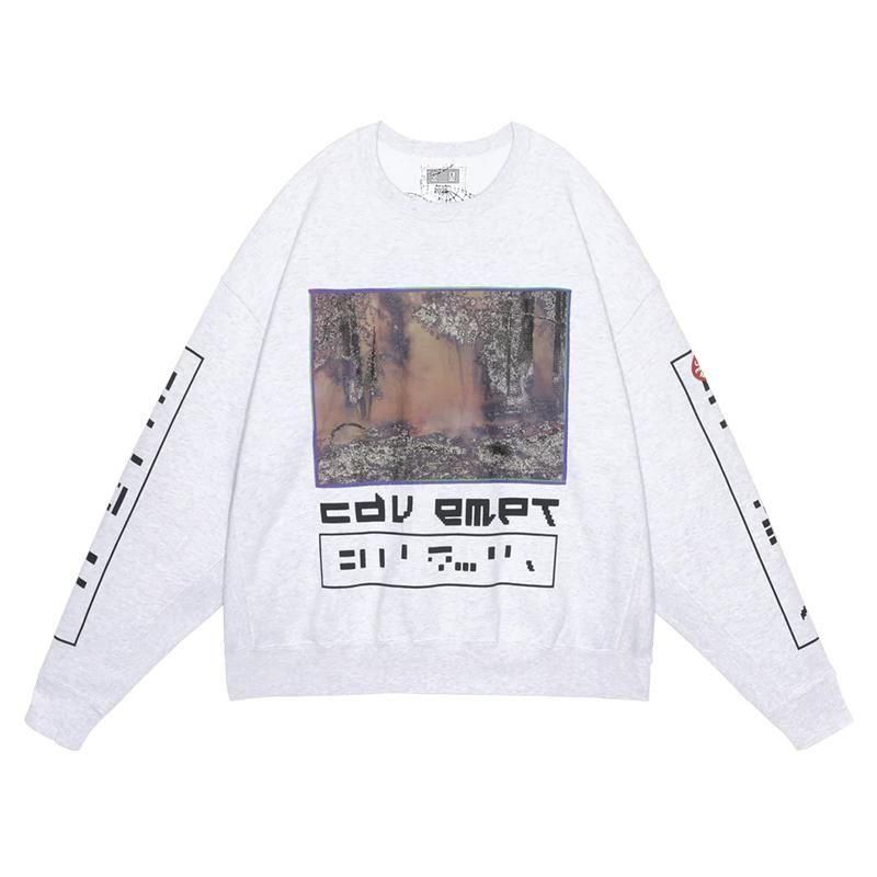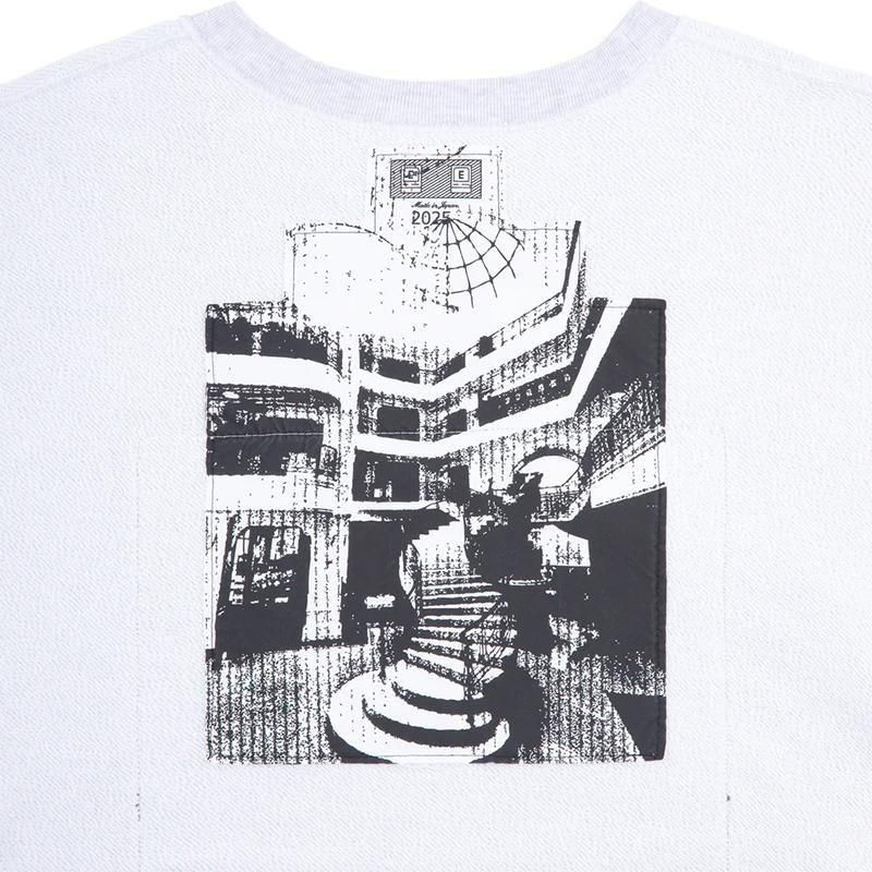 100%コットン。スウェット生地。 プルオーバー。クルーネック。セットインスリーブ。 前身頃、後ろ身頃表、裏に布パッチ。袖にグラフィック。 左袖上部にシリコンパッチ。袖下、脇で生地切り替え。 ワイドシルエット。ウォッシュ加工。 日本製。