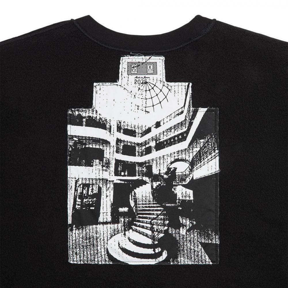 100%コットン。スウェット生地。プルオーバー。 クルーネック。セットインスリーブ。前身頃、後身頃、袖にグラフィック。後ろ身頃裏に布パッチ。左袖上部にシリコンパッチ。袖下、脇で生地切り替え。ワイドシルエット。ウォッシュ加工。 日本製。